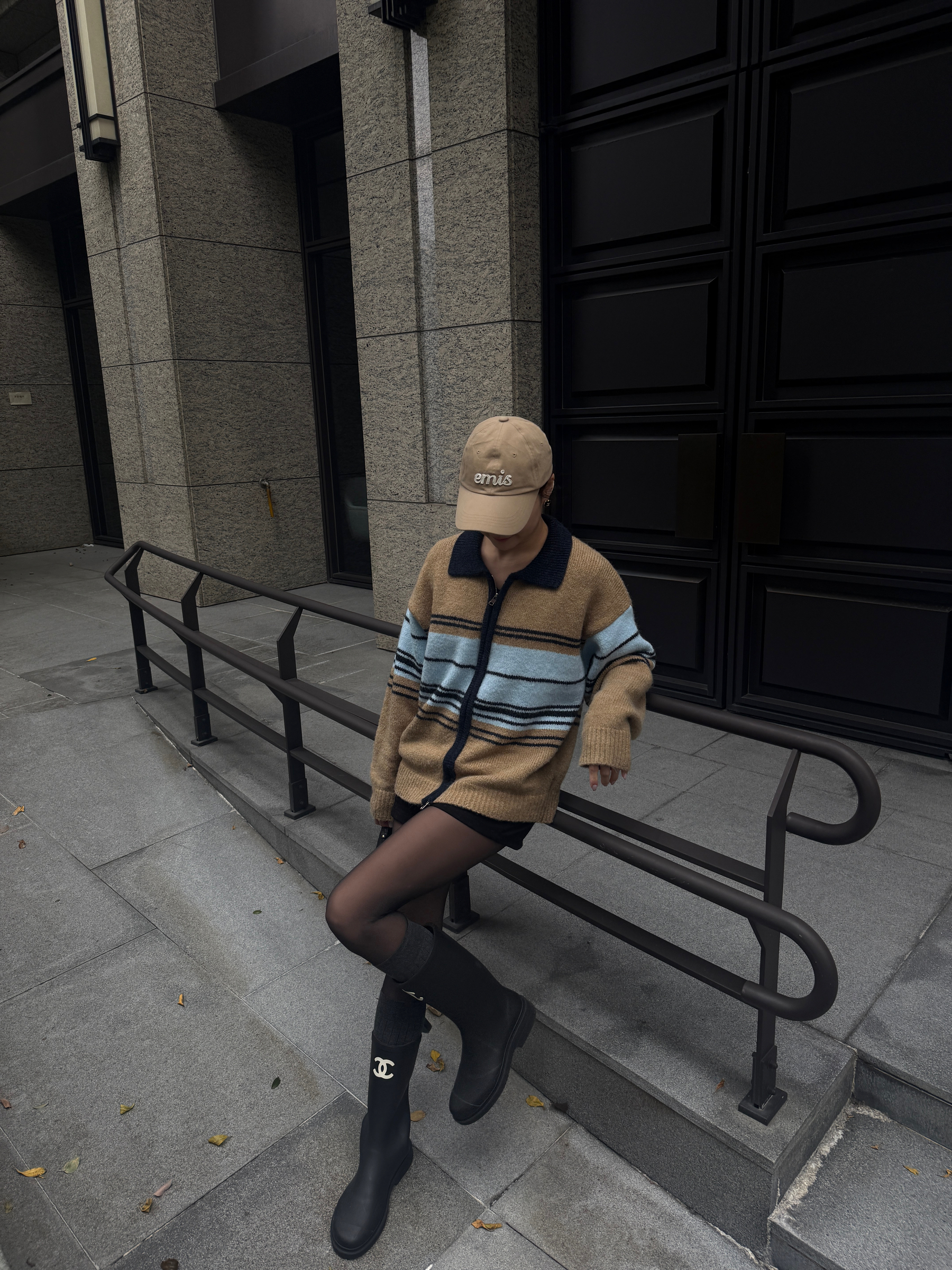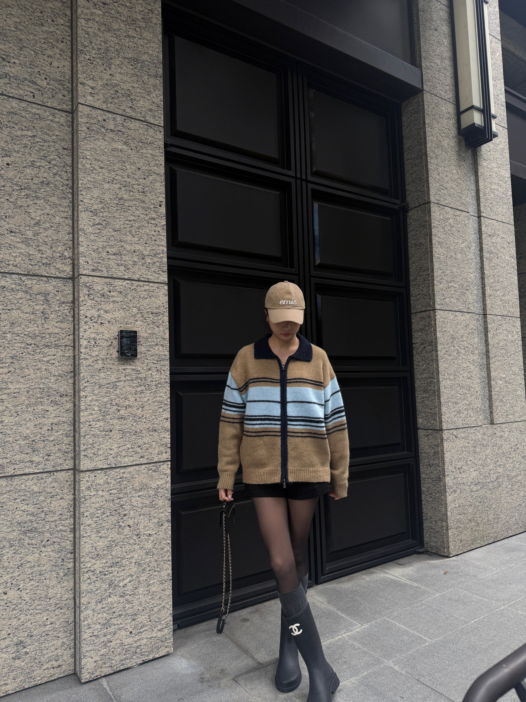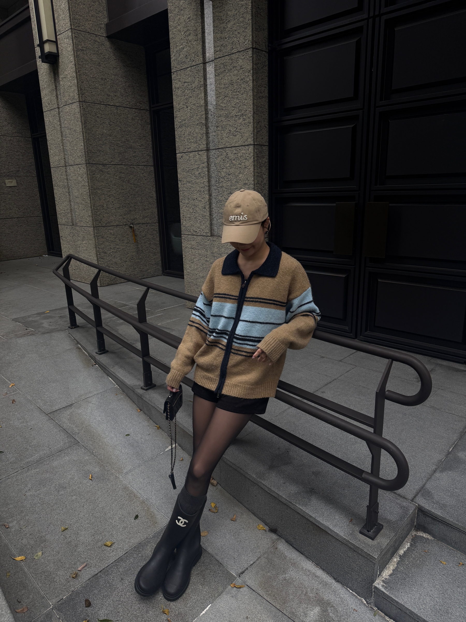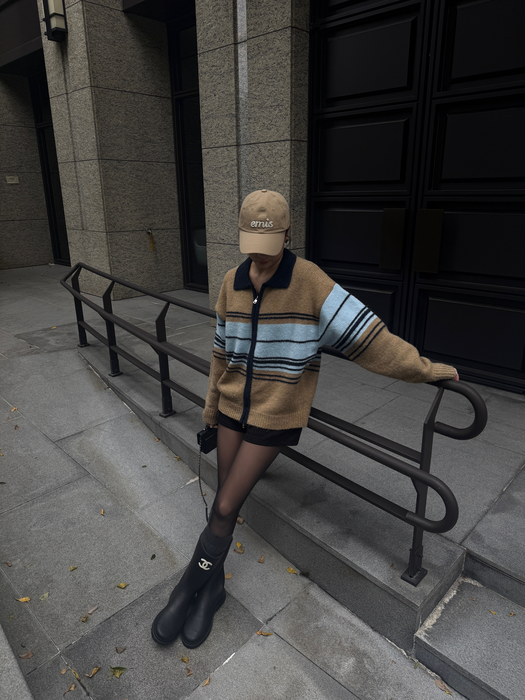 C142正韓🇰🇷拼接撞色條紋翻領毛衣外套